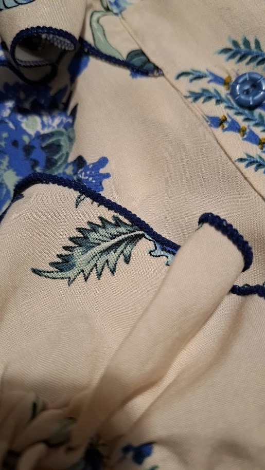 Après plusieurs tests, j’ai fait l’ourlet des volants à la surjeteuse par un surjet trois fils étroit, avec du Fil Mousse à surjeter Extra Fort en 300m – Jack et Cie en bleu marine.