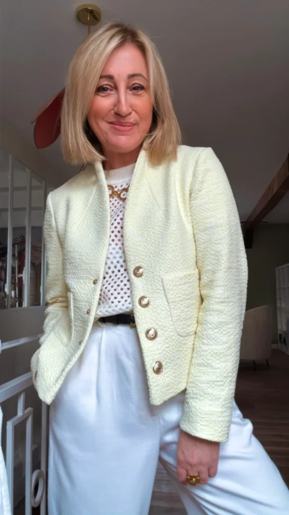 C’est une « petite » veste qui peut se porter comme veste tailleur ou en vêtement extérieur s’il ne fait pas froid.
