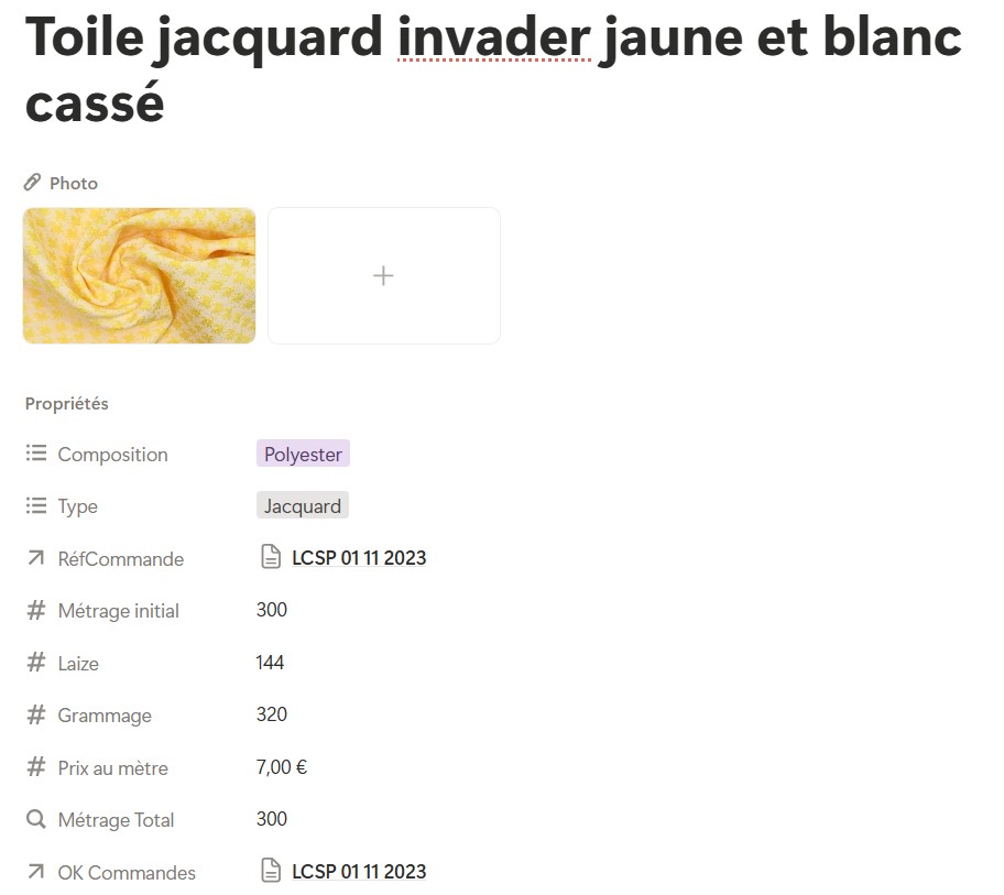Capture d’écran de ma fiche tissu dans l’appllication Notion