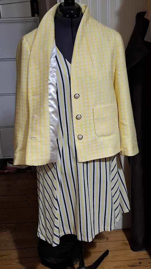 Je sors donc quelques vêtements de demi-saison, et je m’aperçois que je m’étais cousu une robe et un haut dans un tissu à rayures jaune, blanc, bleu (ou noir).